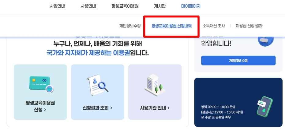 평생교육이용권 신청 후 신청 내역을 조회할 수 있는 방법에 대해서 알려드릴께요